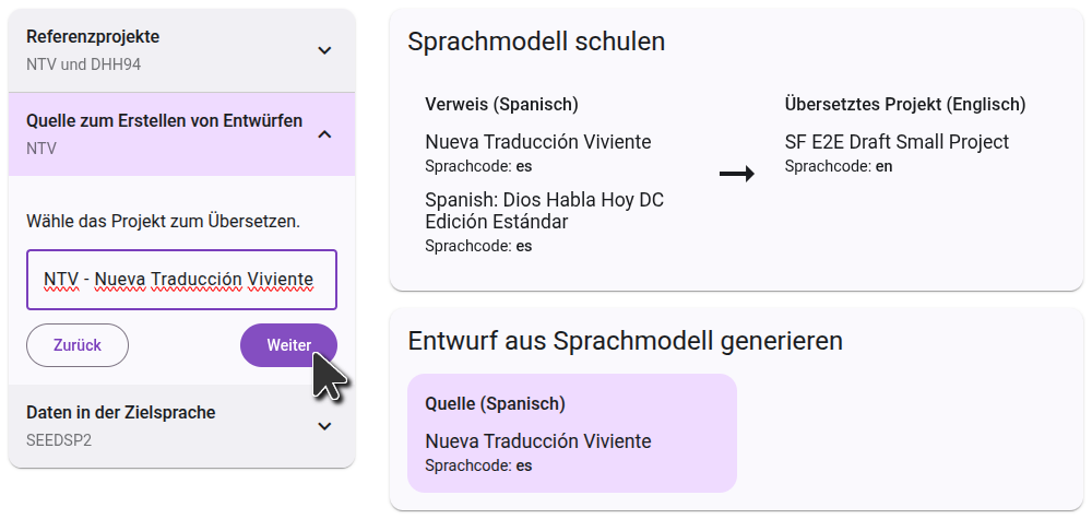 Auf der rechten Seite siehst Du ein Diagramm, das zeigt, wie die von Dir ausgewählten Projekte zur Generierung des Entwurfs verwendet werden. Im ersten Schritt lernt das Sprachmodell aus dem Vergleich zwischen den Referenzprojekten und dem übersetzten Projekt. Im zweiten Schritt nutzt es dieses Wissen, um das Ausgangsprojekt zu übersetzen.