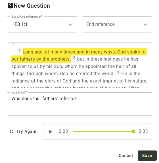 Una pregunta puede aplicarse a un solo versículo o a varios. Escribe una referencia en la casilla de referencia de la Escritura, o haz clic en la flecha desplegable para seleccionar un libro, un capítulo y un versículo. Si quieres que la pregunta abarque varios versículos, introduce una referencia final en la segunda casilla. Una vez que hayas introducido una referencia, aparecerá el texto, con los versículos que hayas elegido resaltados.