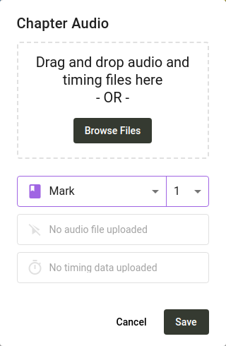 Scripture Forge puede reproducir una grabación de audio de cada pasaje para los revisores de la comunidad. Para ello, deberá cargar un archivo de audio y un archivo de tiempo para cada capítulo. Los archivos de tiempo permiten a Scripture Forge resaltar cada versículo a medida que se pronuncia.